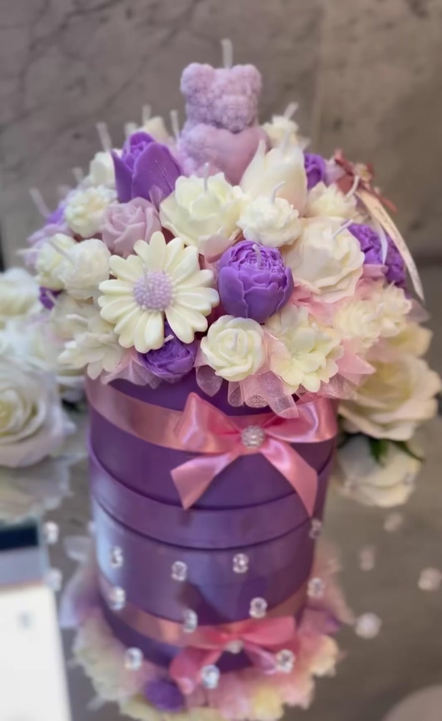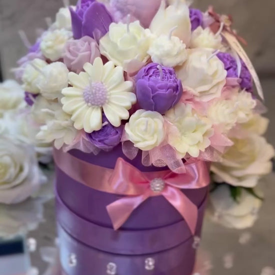 Indulge in the elegance of our Luxury Purple and Cream Candle Bouquet, featuring approximately 50 exquisite individual candles crafted from premium soya wax. This stunning arrangement is perfect for any occasion, adding a touch of sophistication and warmth to your space. Each candle not only enhances your decor but also provides a clean, long-lasting burn, making it an ideal gift or a delightful treat for yourself. Elevate your ambiance with this beautiful bouquet that embodies luxury and charm.